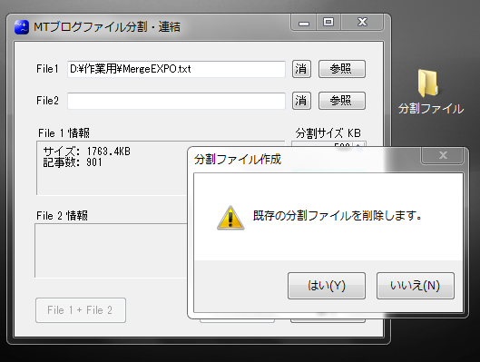 すでに「分割ファイル」フォルダがある場合には、フォルダ内のファイルが削除される。