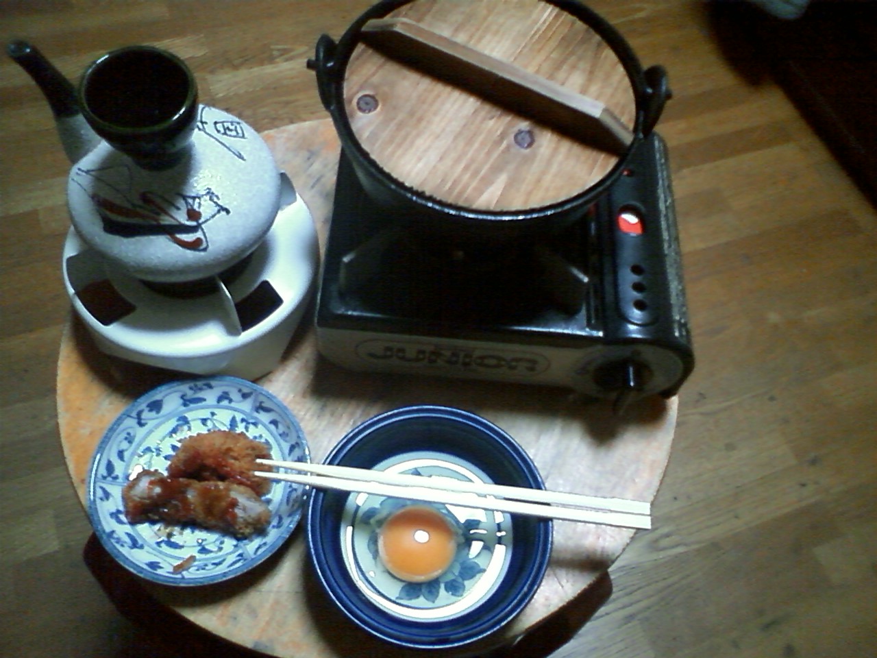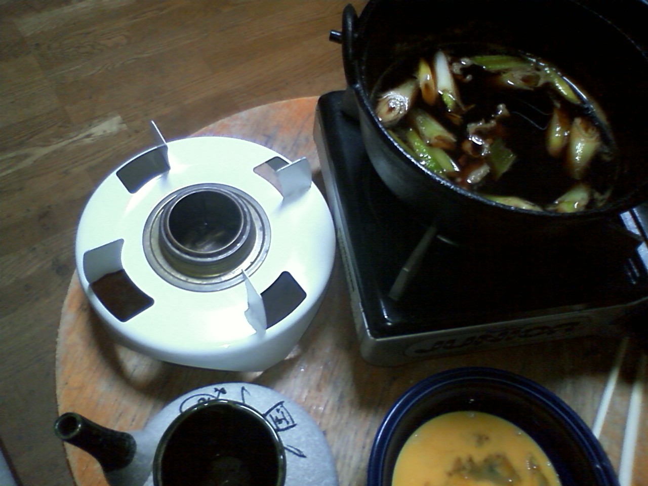 小さなカセットコンロで鍋物をして、隣にアルコールバーナーを置いて酒燗をする。