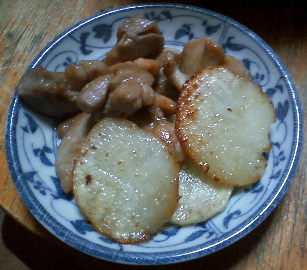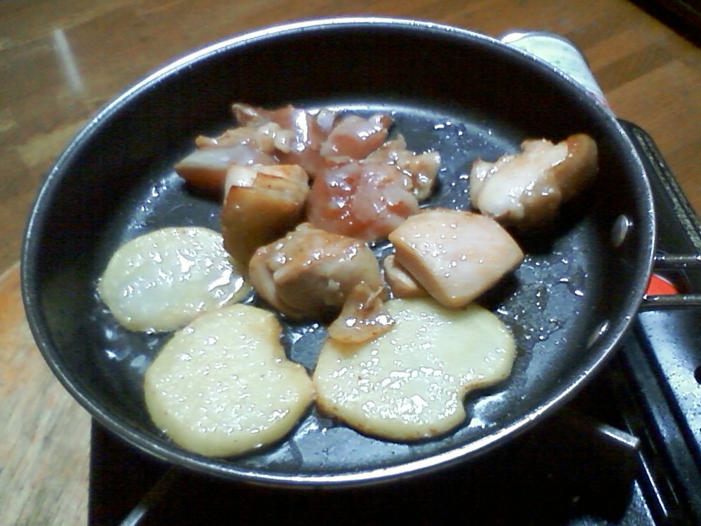 ジャガイモを薄く切って、鶏肉と一緒に炒めるだけ。