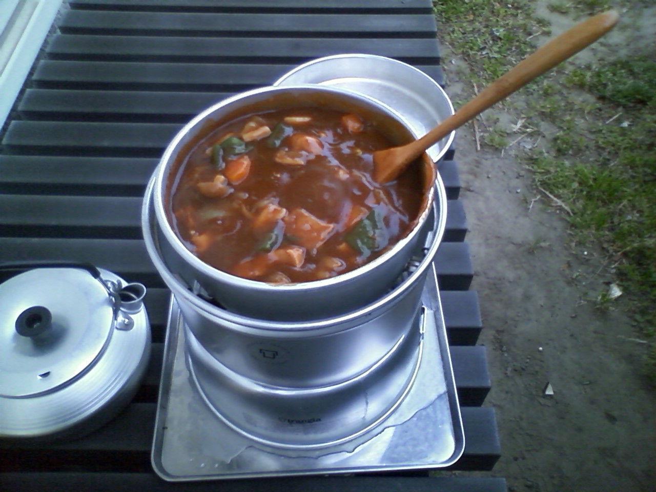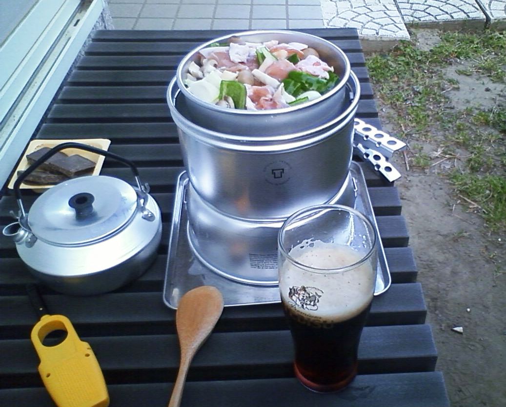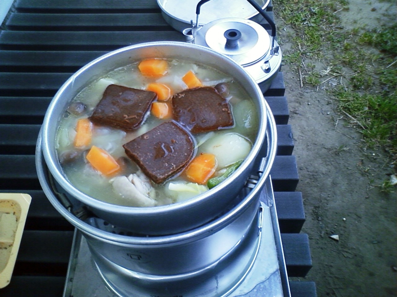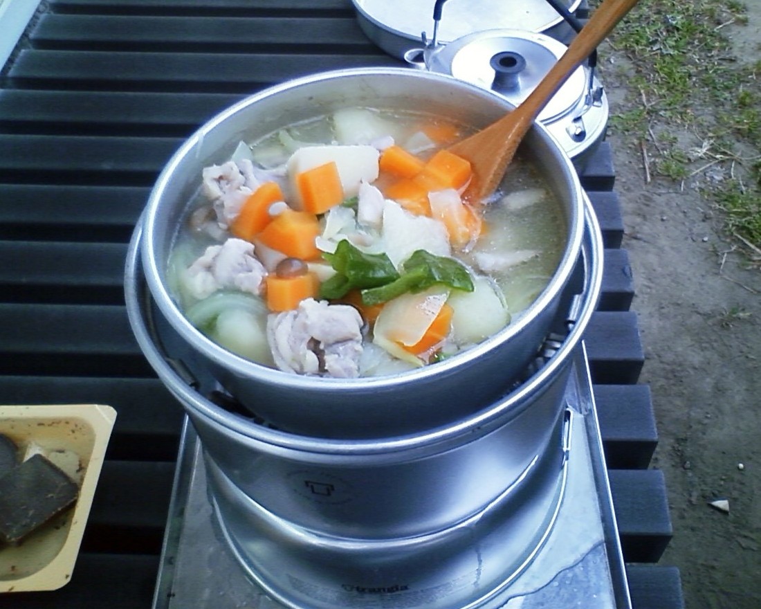 温められたヤカンの水はシチューを作る時に使うので、燃料節約の一石二鳥になる訳だ。