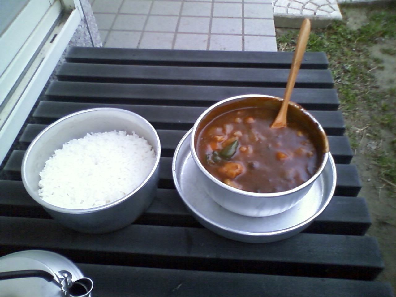 一合のご飯と、鶏肉のドミグラスシチューが出来上がったよ。
