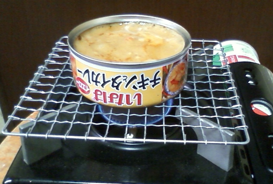 そこで缶詰を暖めるために、カセットコンロに乗せてみた。