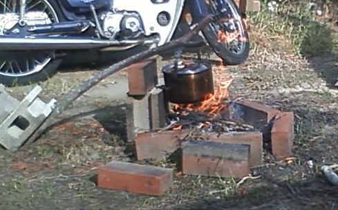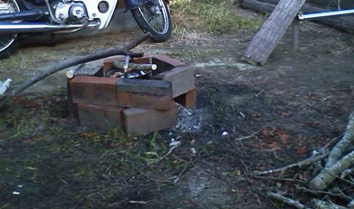 この焚き火でモツを煮込んでやれば、煮込みの燃料代はタダになるし・・・