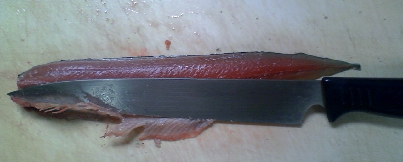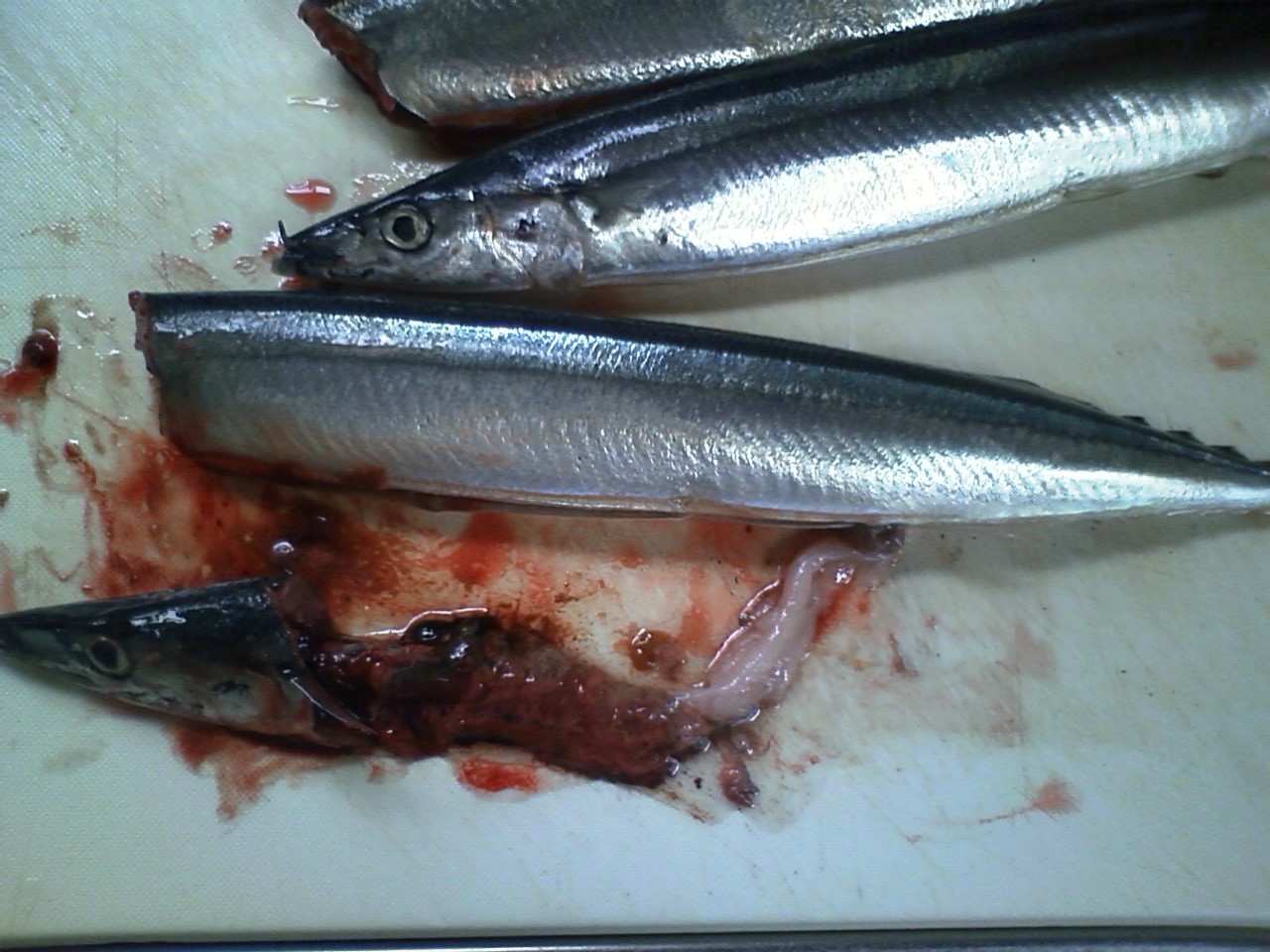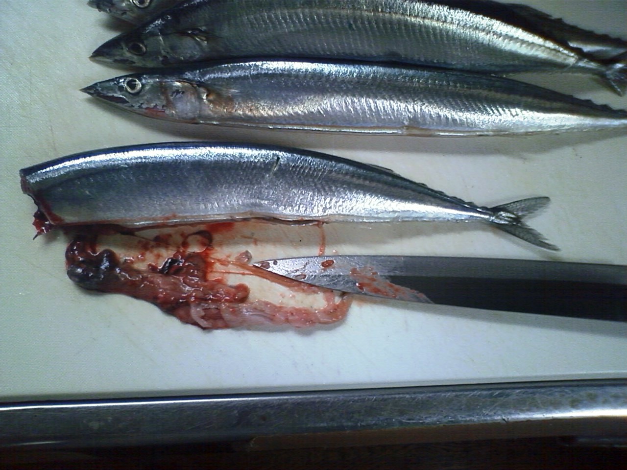 そのような鮮度の落ちた魚は、頭を落として腹を裂いて包丁で内蔵を掻き出す。