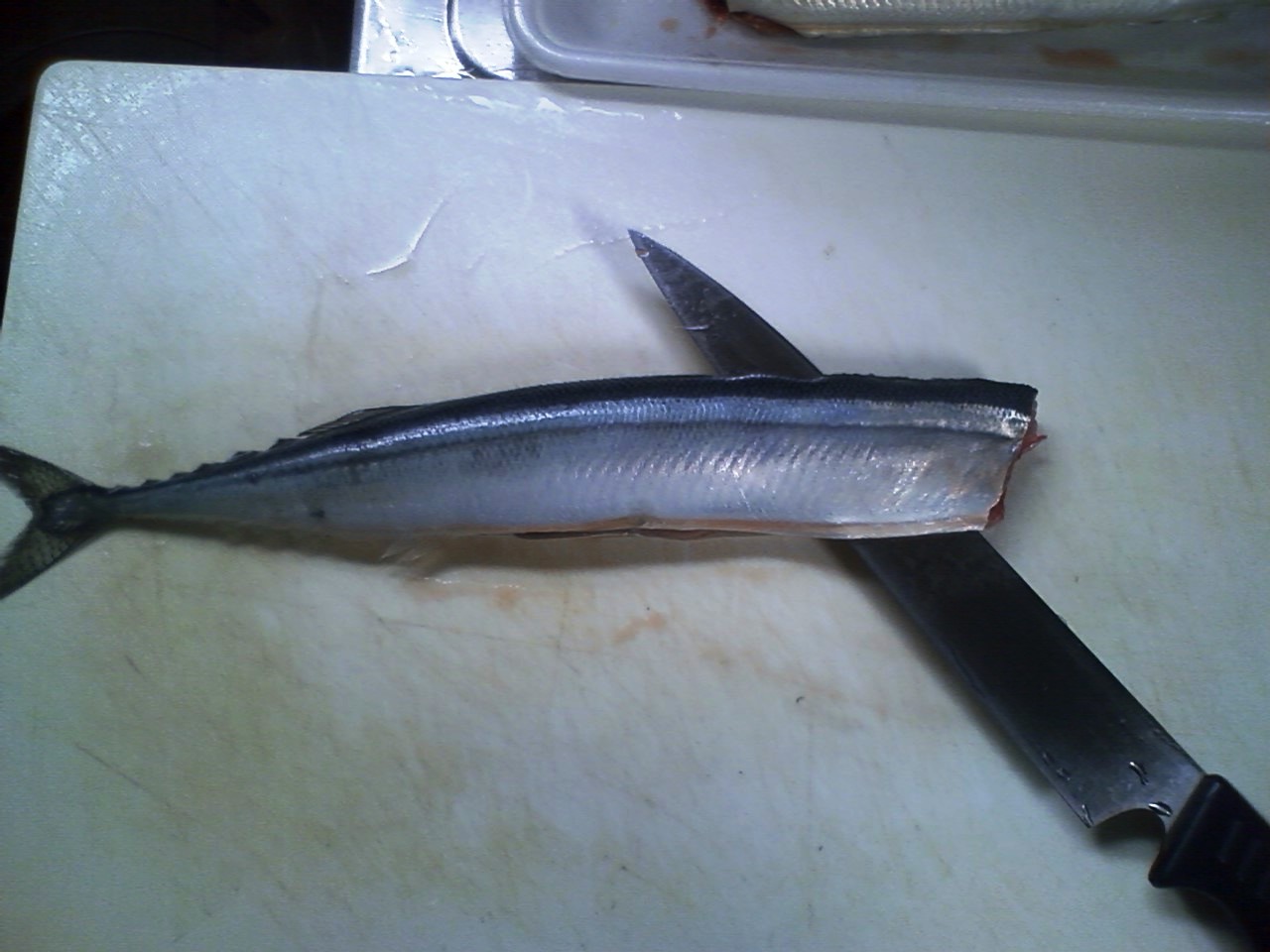 今回のサンマは細い魚なので、頭の方から一回でスッと切れば良い。