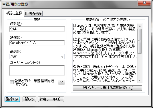 タグを辞書に登録すると、簡単に呼び出して書く事が出来ます。