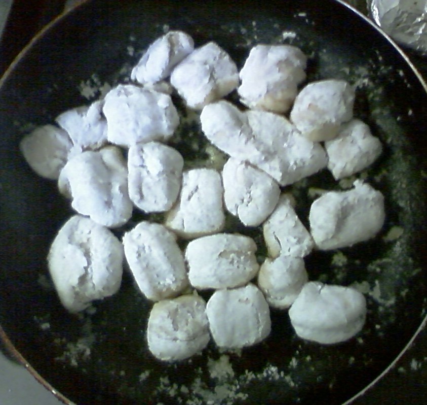茹でて水切りをした白子に、片栗粉をまぶしてフライパンで焼く。
