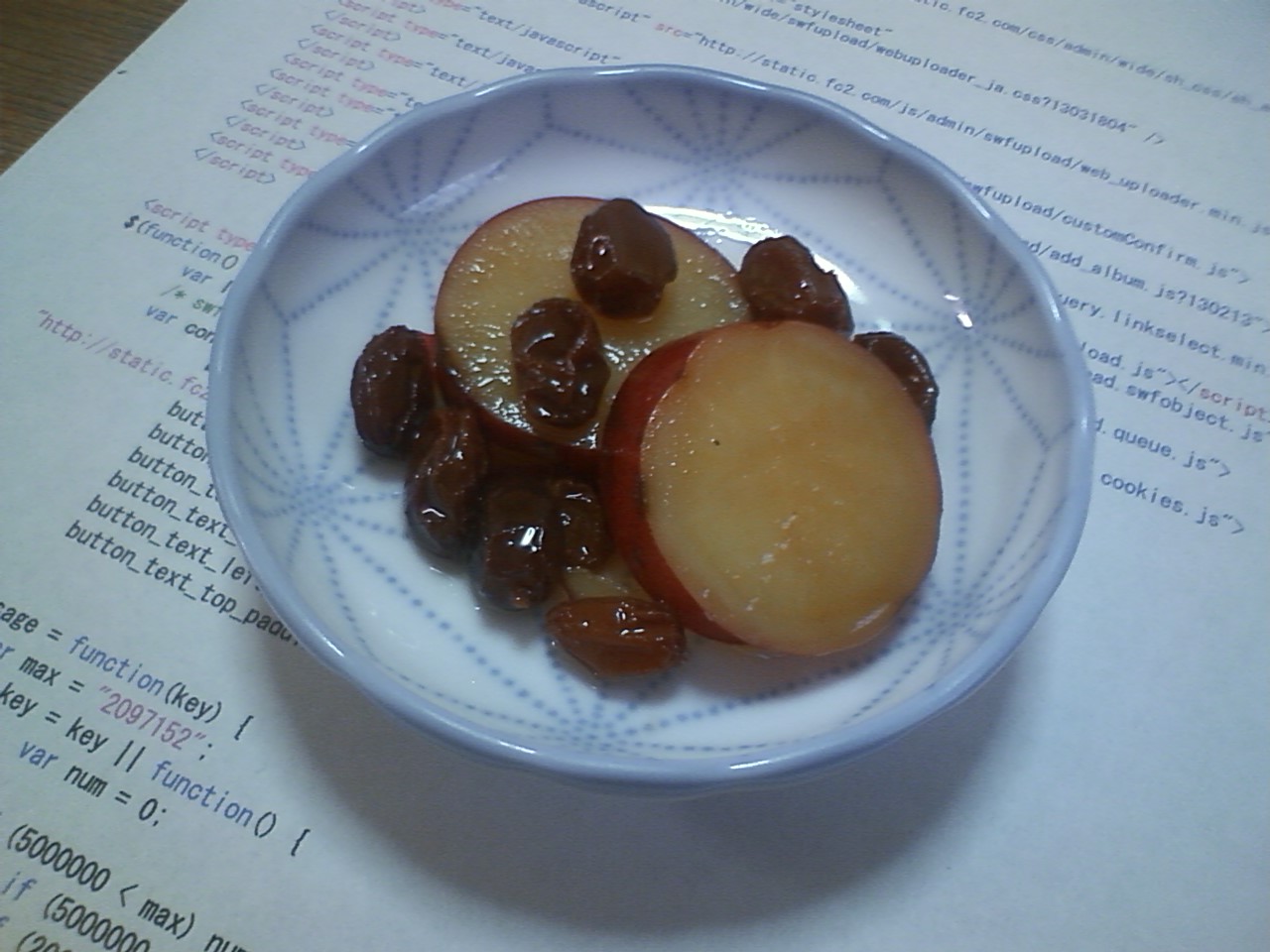 いったん煮汁を捨てレーズンを追加して、新しいく水と少々の塩と砂糖を加えて煮る。