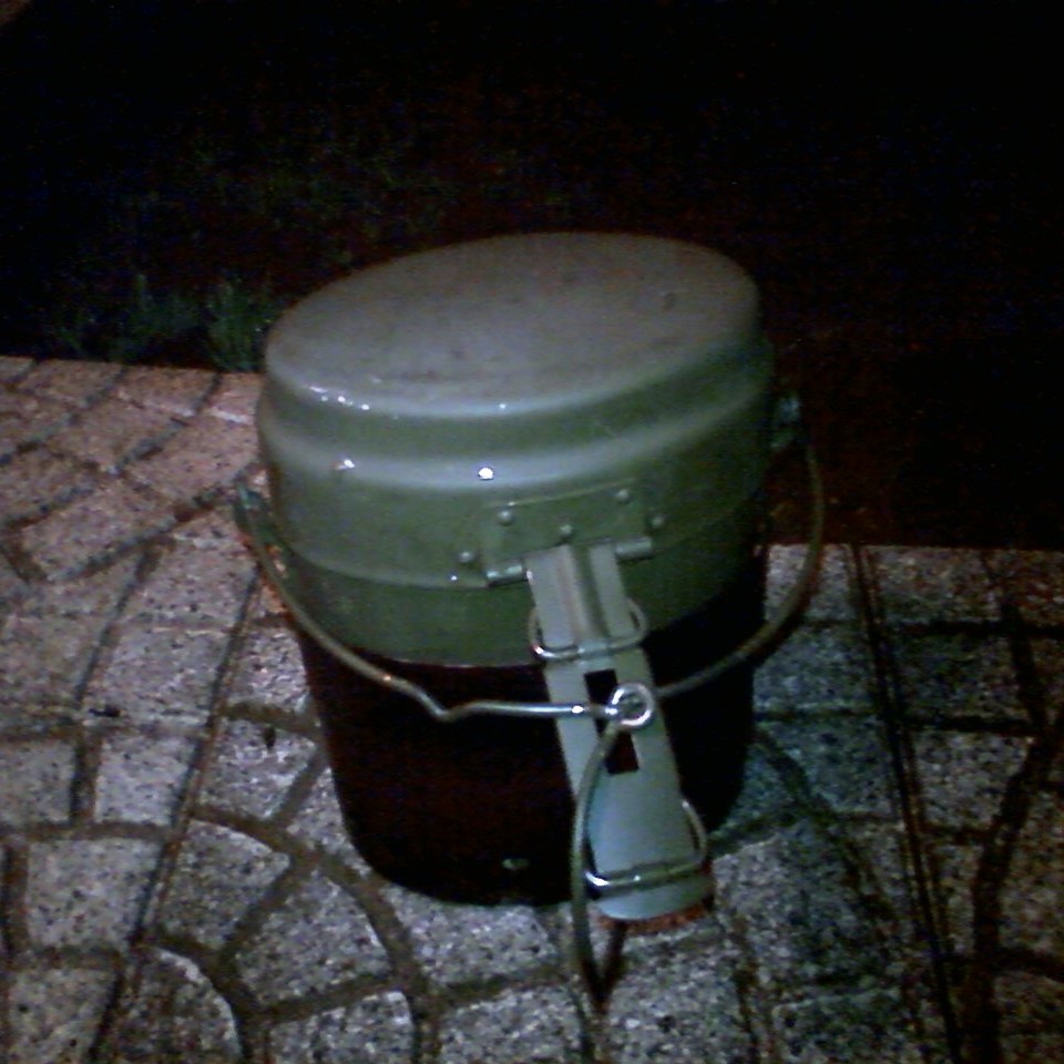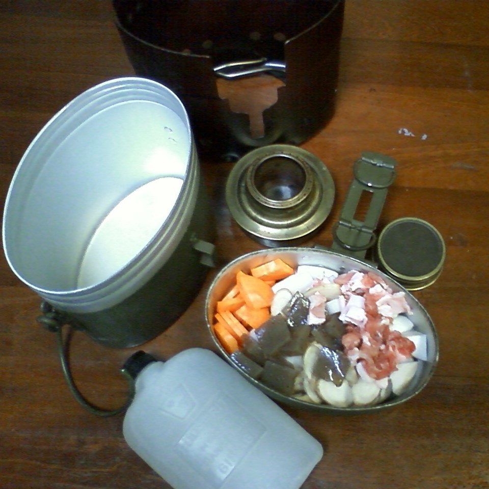 装備:スウェーデン軍の飯盒(はんごう)、トランギアTR25