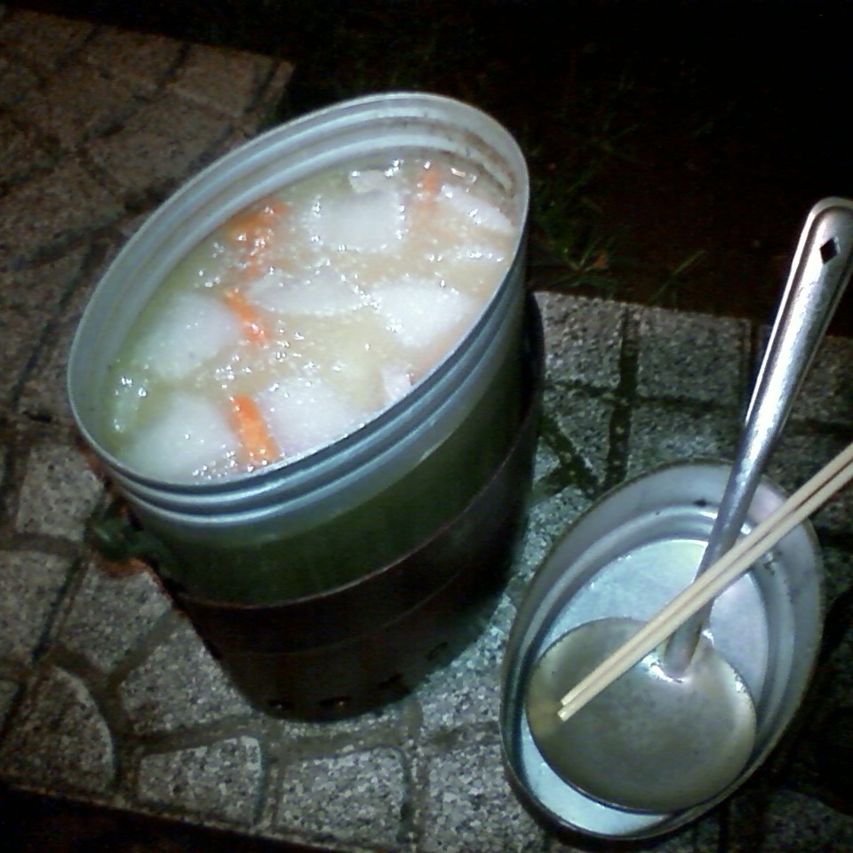 飯盒に具材料を放り込み、適当に清水をジャバジャバと注いで火にかける。