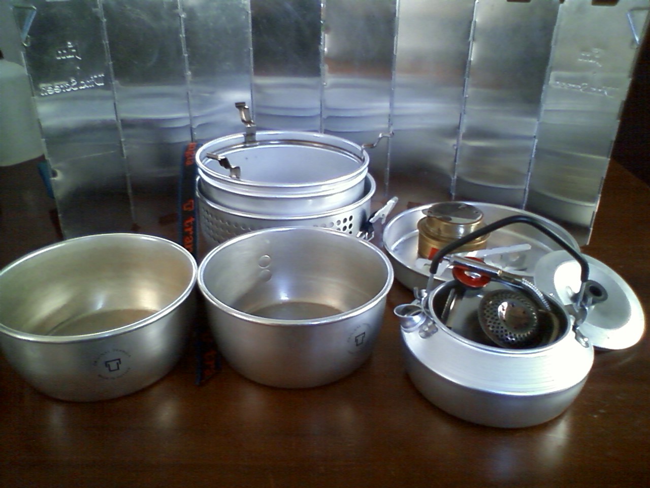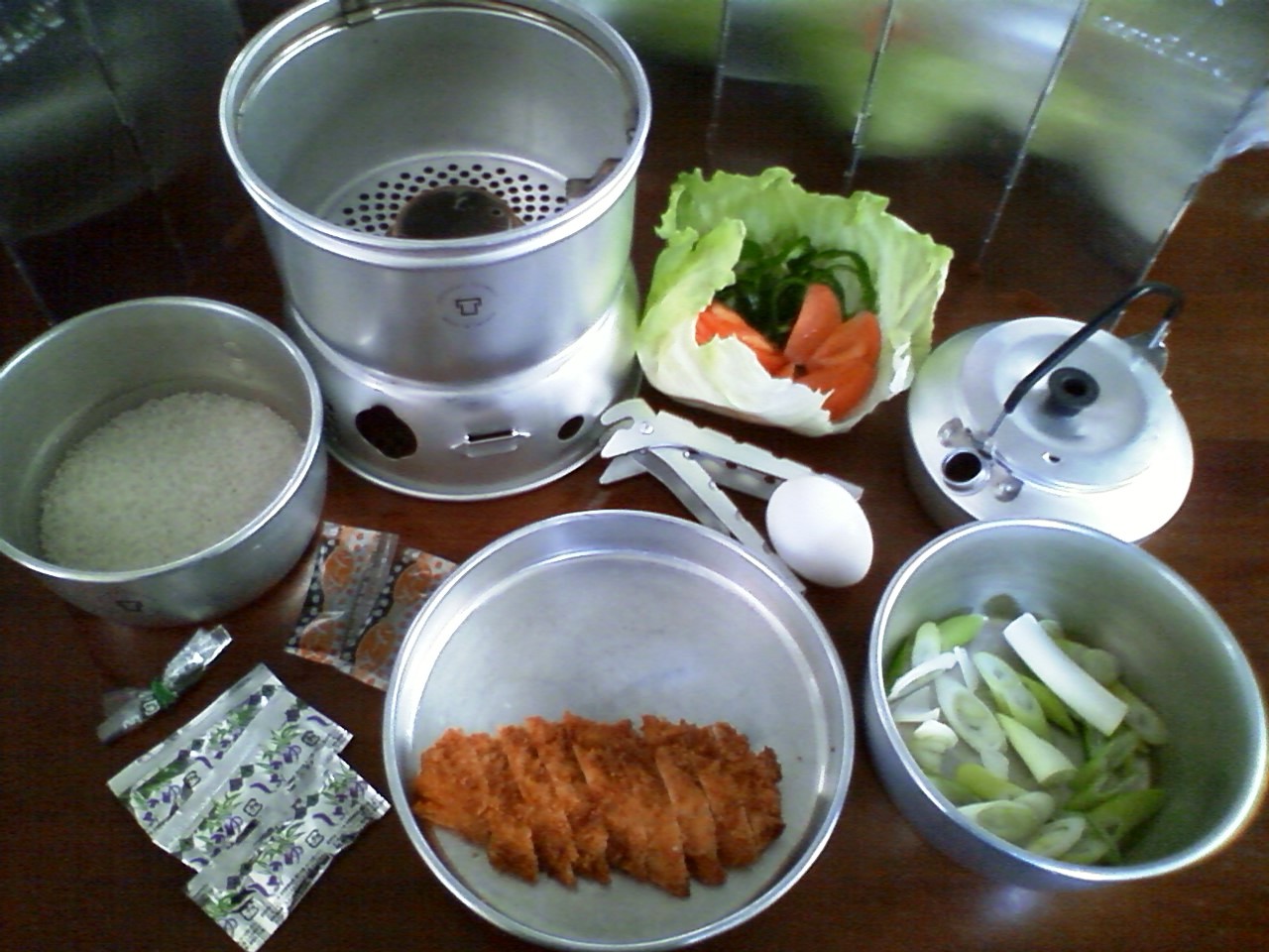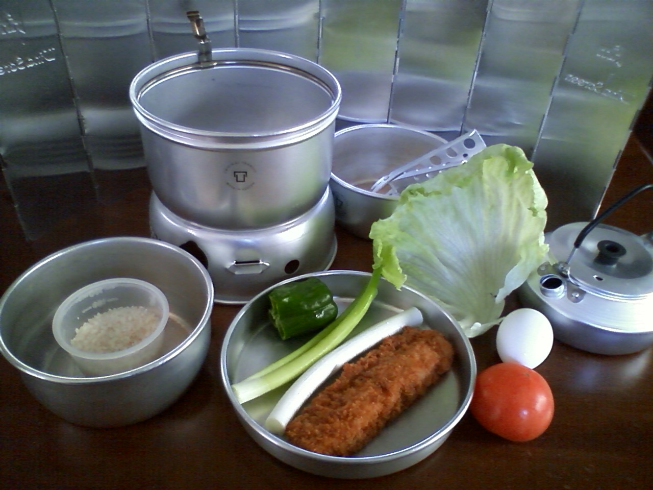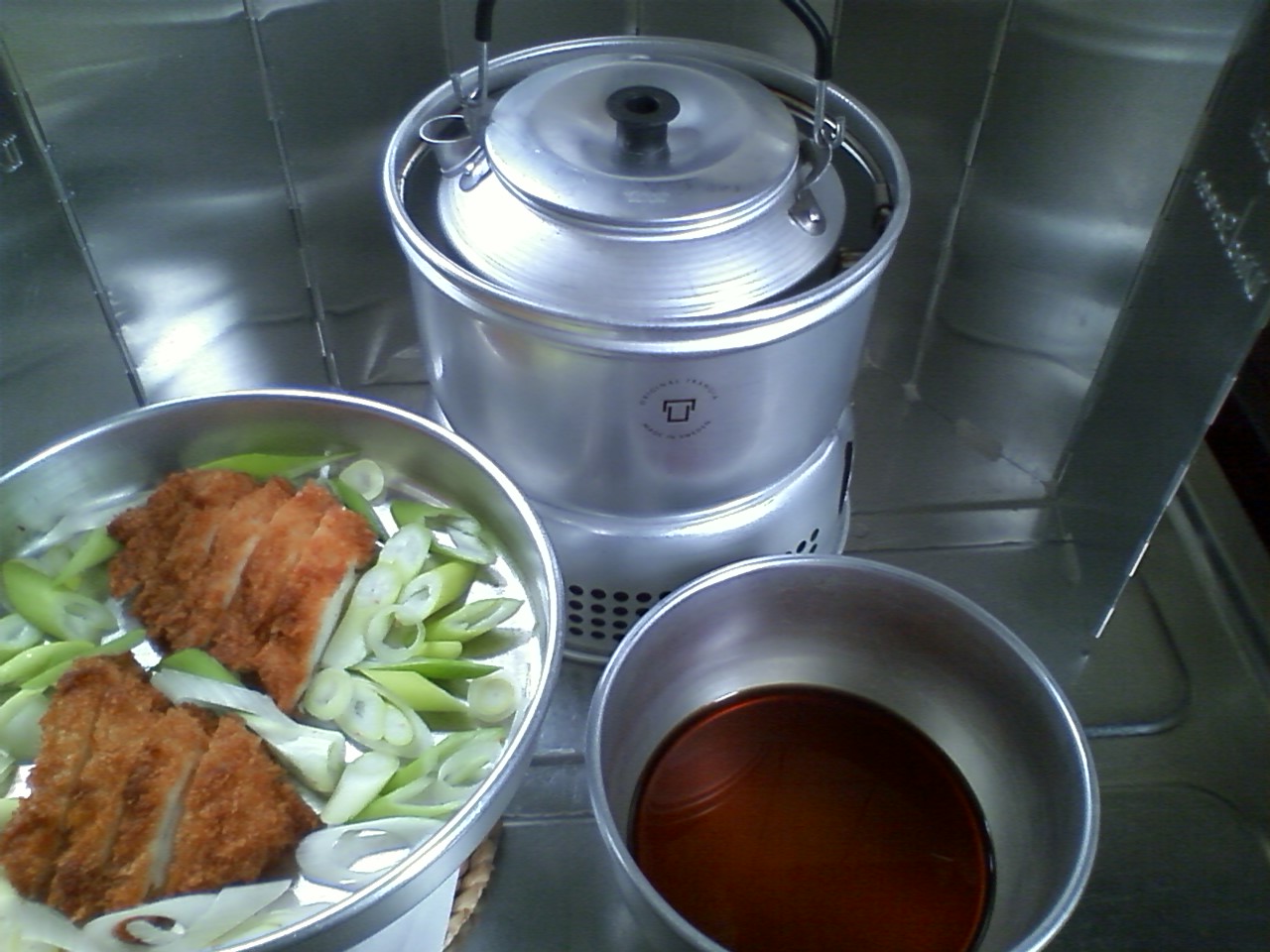 炊飯時のフタはもう一つの鍋を重ねて、ヤカンに水を入れて重石にする。