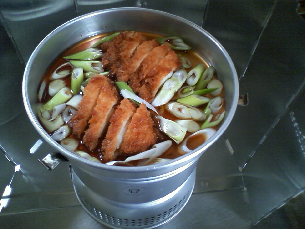煮汁の鍋にヤカンの湯を入れて薄め、イカフライの入ったフライパンに注ぎ入れる。