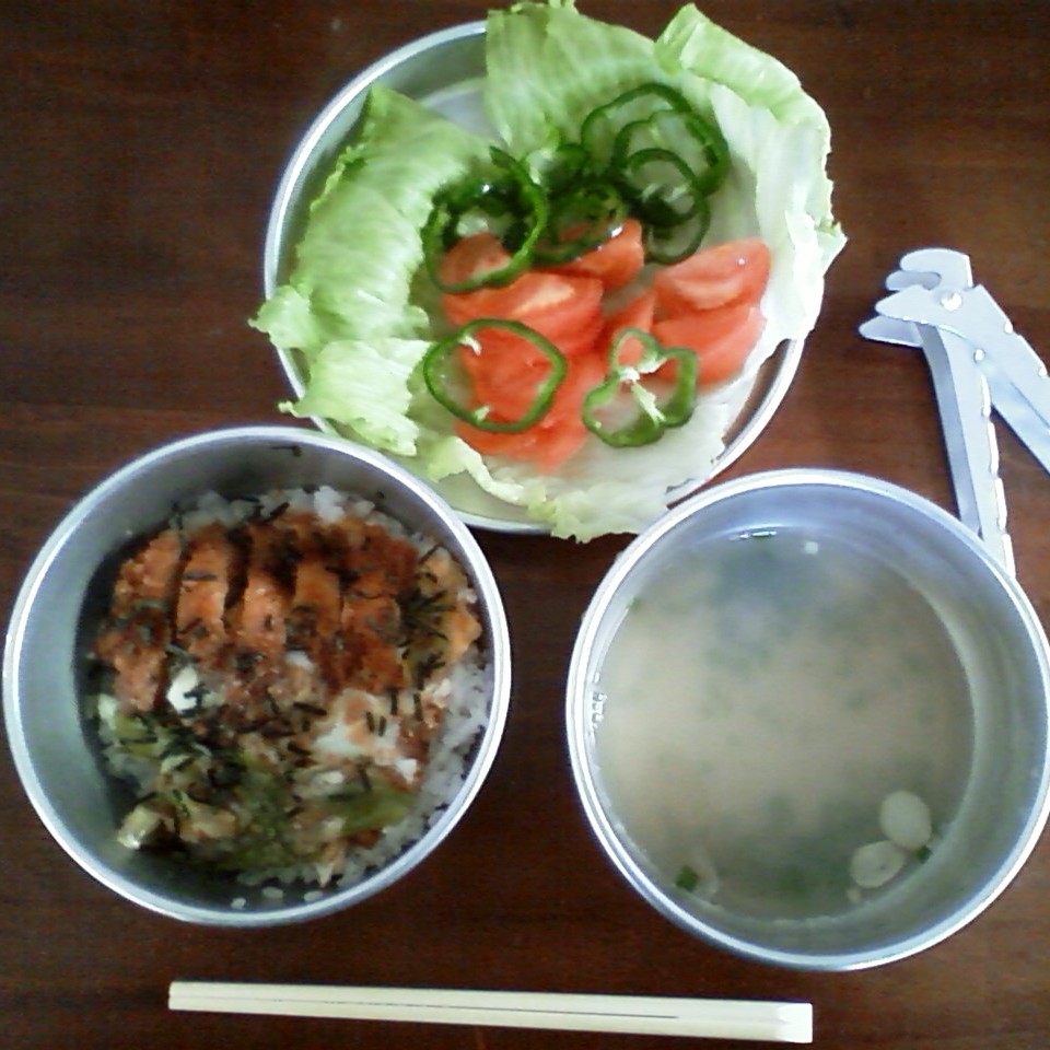 空いたフライパンに生野菜を並べ、玉子溶きに使った鍋にインスタント吸い物を入れる。