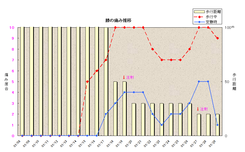 歩行中と安静時の痛み度合をそれぞれに分けて記録してある。