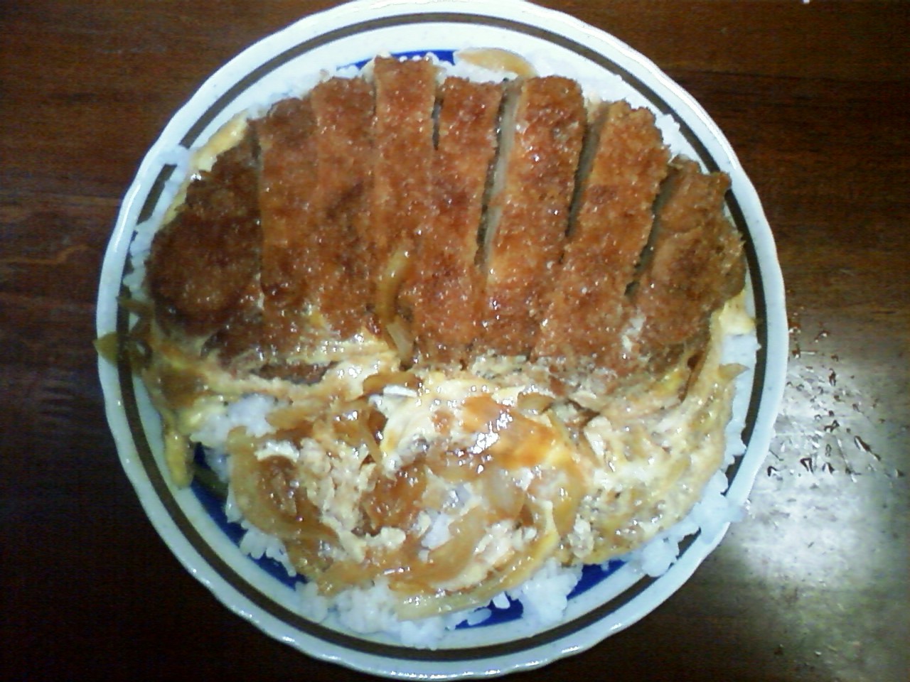 普段は木の椀か丼に盛るのだが、この日のカツ丼は皿に盛った。