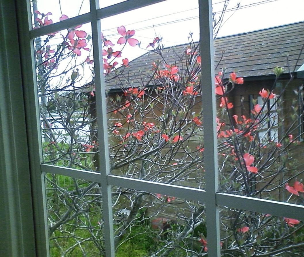 出窓のすぐそばに、ハナミズキが花を咲かせている。
