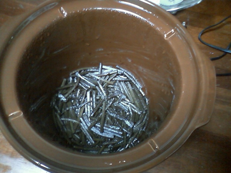 昨日の昼頃に採って来たフキを、スロークッカーで煮た。