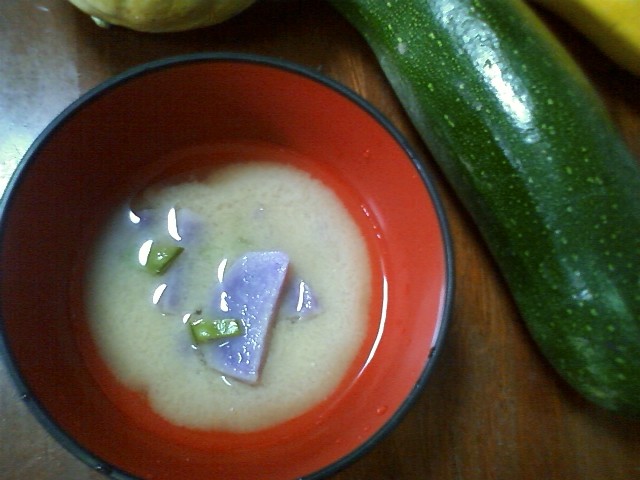 今朝の味噌汁、紫色のジャガイモを使ってみた。
