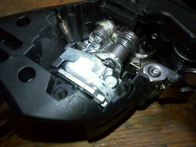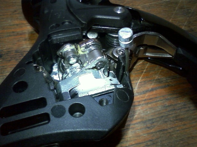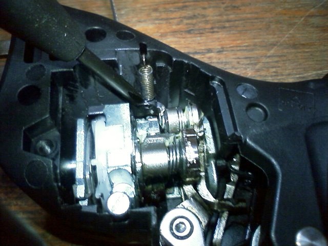 内側レバーから連動して動く部品を引っ張っているようだ。