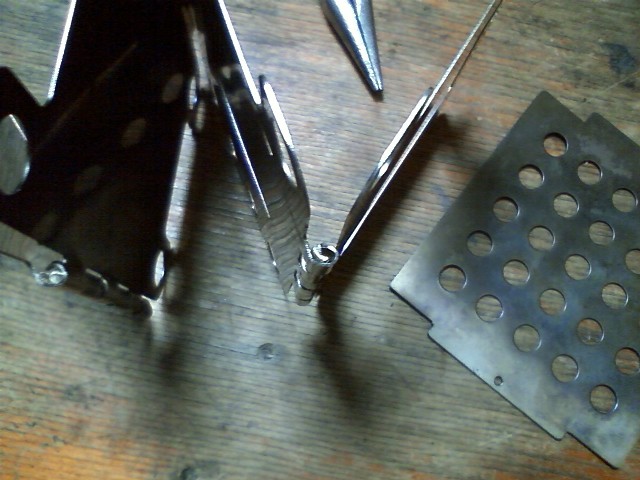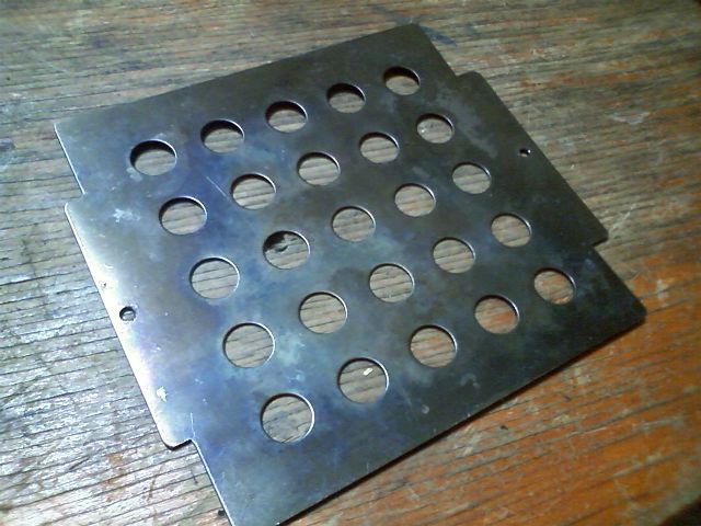 上の右の写真は底板に小穴を開けたものだが、ステンレス板が硬いので苦労した。