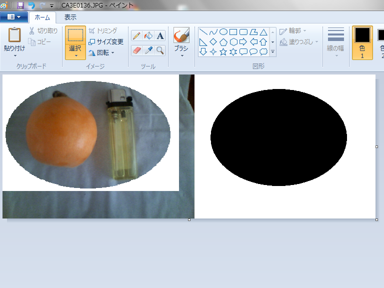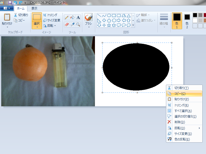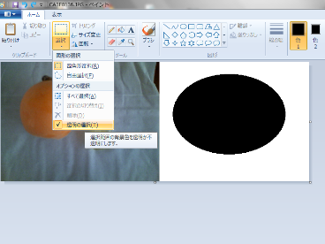 次に切り抜く画像の上で、右クリックで貼り付けをすると黒色楕円の部分が透明になる。