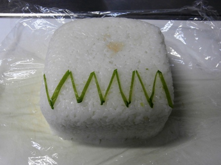 弁当箱と蓋にラップを敷いて、両方に酢飯をいっぱいに詰める。