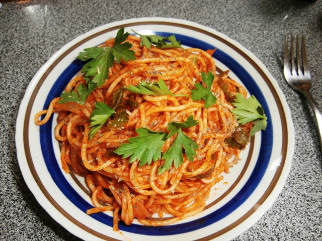 ケチャップを使って、かつてのナポリタンのようなスパゲティ。