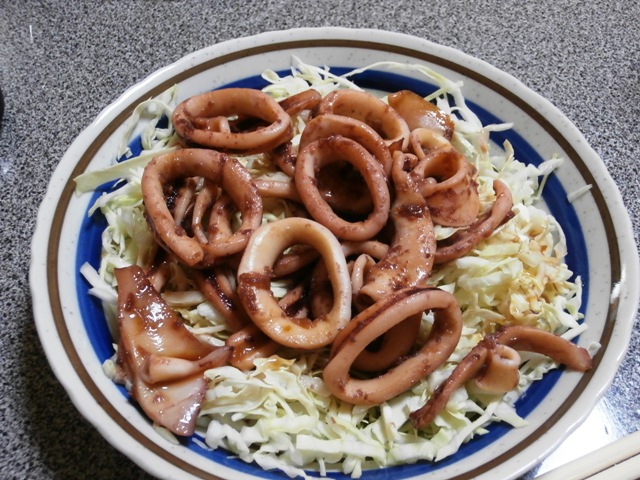 更に千切りキャベツを山盛りにして、炒めたイカを乗せる。