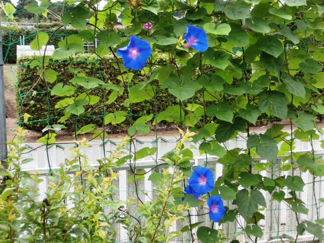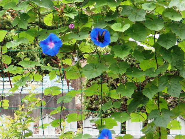 毎日アサガオが咲いているが、ふと見ると蝶々が飛んで来て蜜を吸っているようだ。