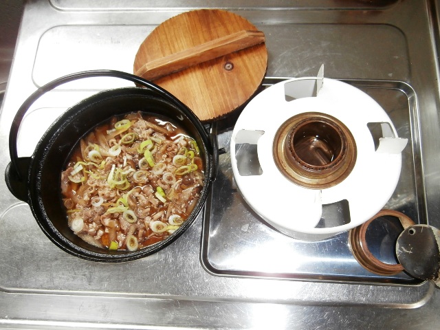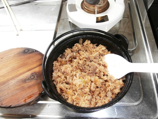 先日のすき焼きで使った鉄鍋に、これまた食べきれなかった牛肉を具材にした釜めし。