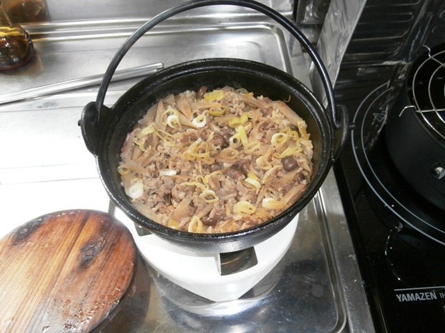 白米一合に、牛肉、シメジ、ゴボウ、長ネギ、ショウガの煮物を合わせて炊く。