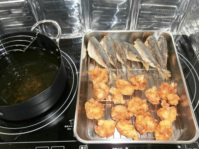 また、アジの唐揚げをすると油が傷むので、ついでに鶏の唐揚げも揚げた。