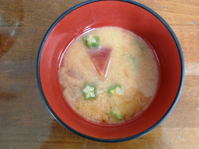柔らかくなれば茹で汁を捨てて、新たな水で味噌汁を作り、最後にオクラを入れて出来上がり。