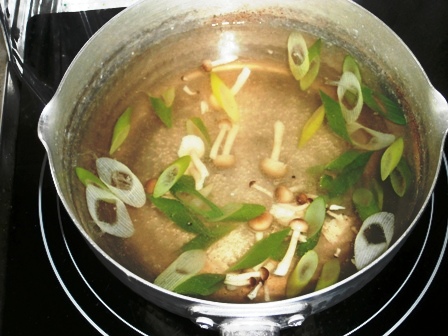 鍋でシメジと長ネギの青い部分も一緒に切って、長ネギが十分に柔らかくなるまで煮る。
