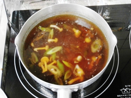 カツオ風味ダシの素、醤油と酒を足し煮立てて味を調節する。