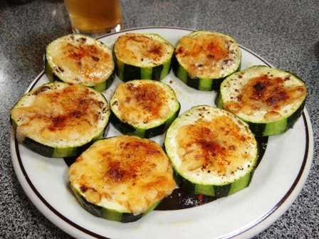 ズッキーニにオリーブ油を塗ってオーブンで焼く、チーズを乗せて塩コショウ。