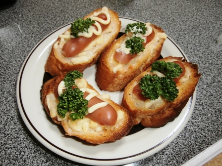 フランスパンに安物ウインナを乗せて、これまたオーブン焼きしたのだが。