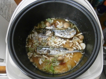 サンマを焼き始めたところで味付け汁で炊飯器の水加減をして、サンマの焼き上がりまでスタンバイ。