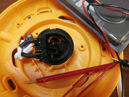 次に電源コードの付いているケトル置き台を調べると、やはり導通に傷みがあるかに見える。