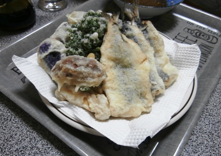 ナス、シイタケ、パセリ、そしてイワシを揚げた。
