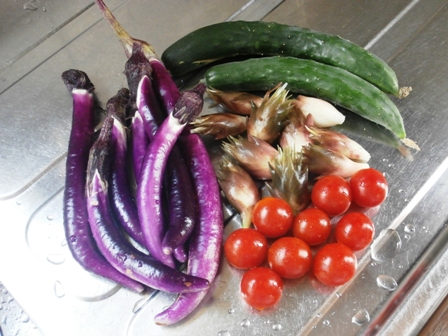 今朝はキュウリ、細長いナス、ミョウガ、ミニトマトを収穫した。