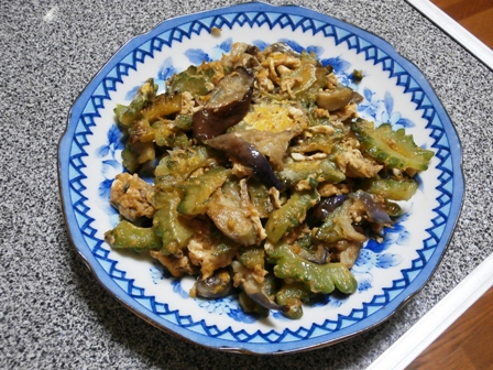 先日は庭のニガウリが大きくなったので収穫し、マー坊という細ナスと炒め物にした。