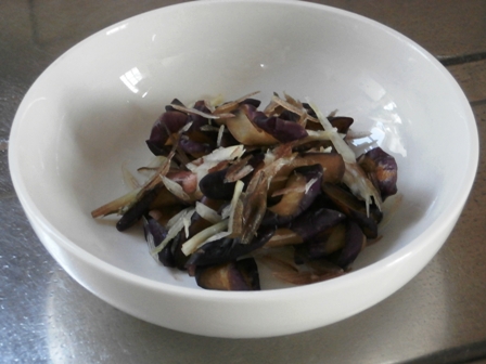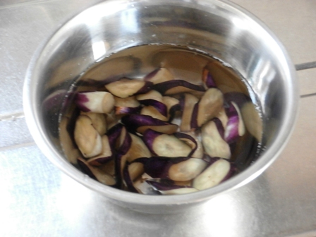 普通のナスより加熱の変色が強いようで、熱すると表皮の紫色がすぐに茶色になってしまう。