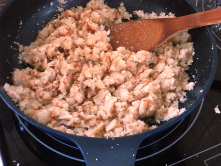 水洗いして強く絞ったおからをフライパンに移し、中火以上で炒って水分を飛ばす。