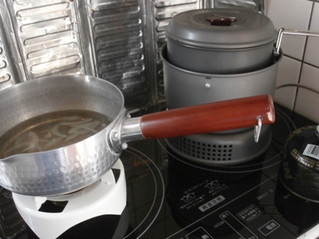 停電の我が家ではIHコンロが使えないので、アルコール、ガス缶の器具を利用。