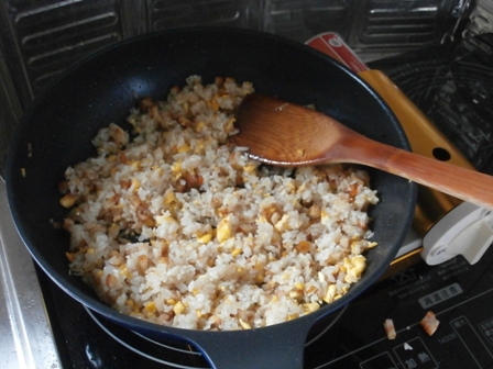 米飯をフライパンで炊き、玉子焼き、塩鮭を焼き。