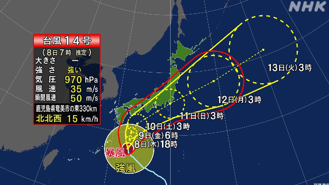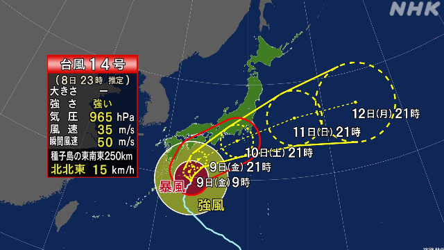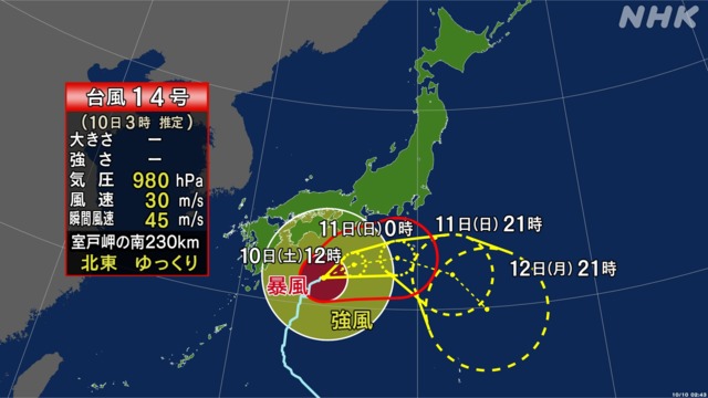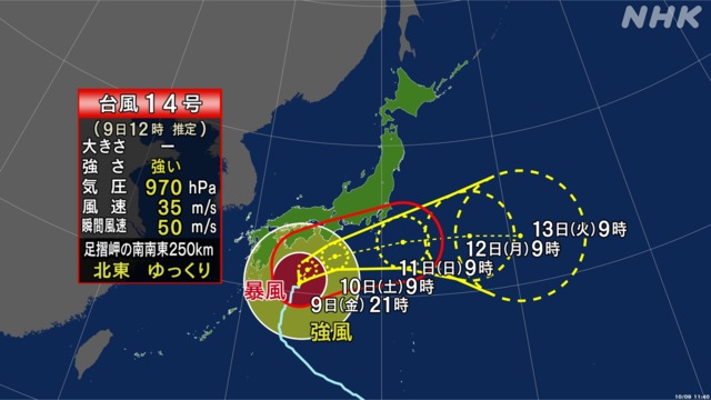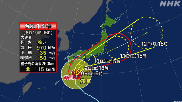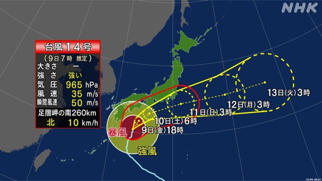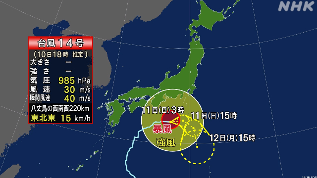 去年の台風15号が到来した時より一か月遅れで、今年の14号が怪しい進路だ。