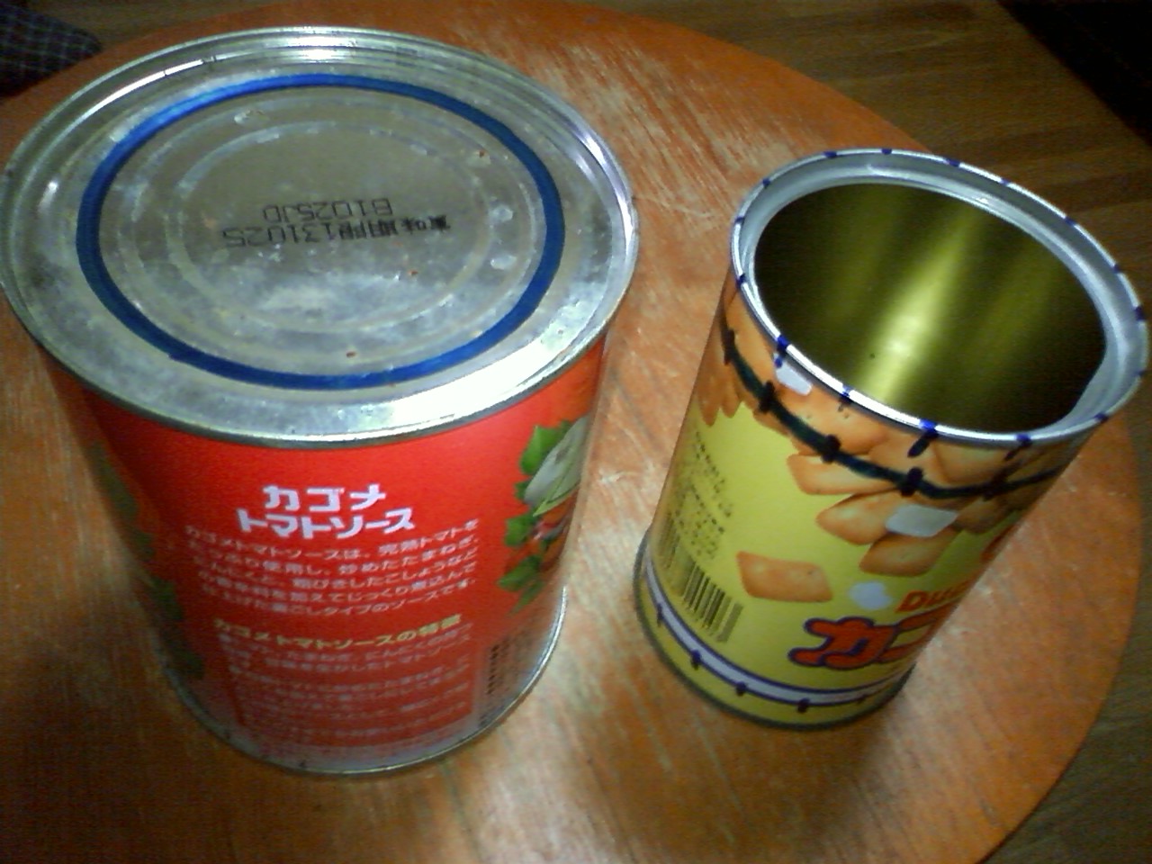 拾ってきた空き缶と、賞味期限を15年以上も過ぎた乾パンの缶詰だ。