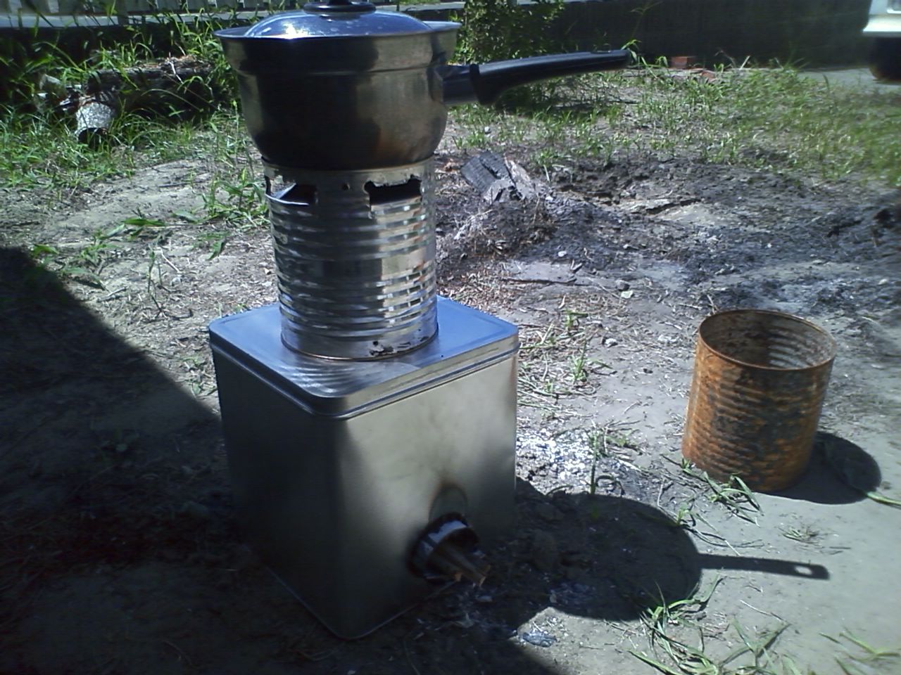 材料はカセットガス缶3本と四角のせんべい缶で、断熱材は庭の土を使った。