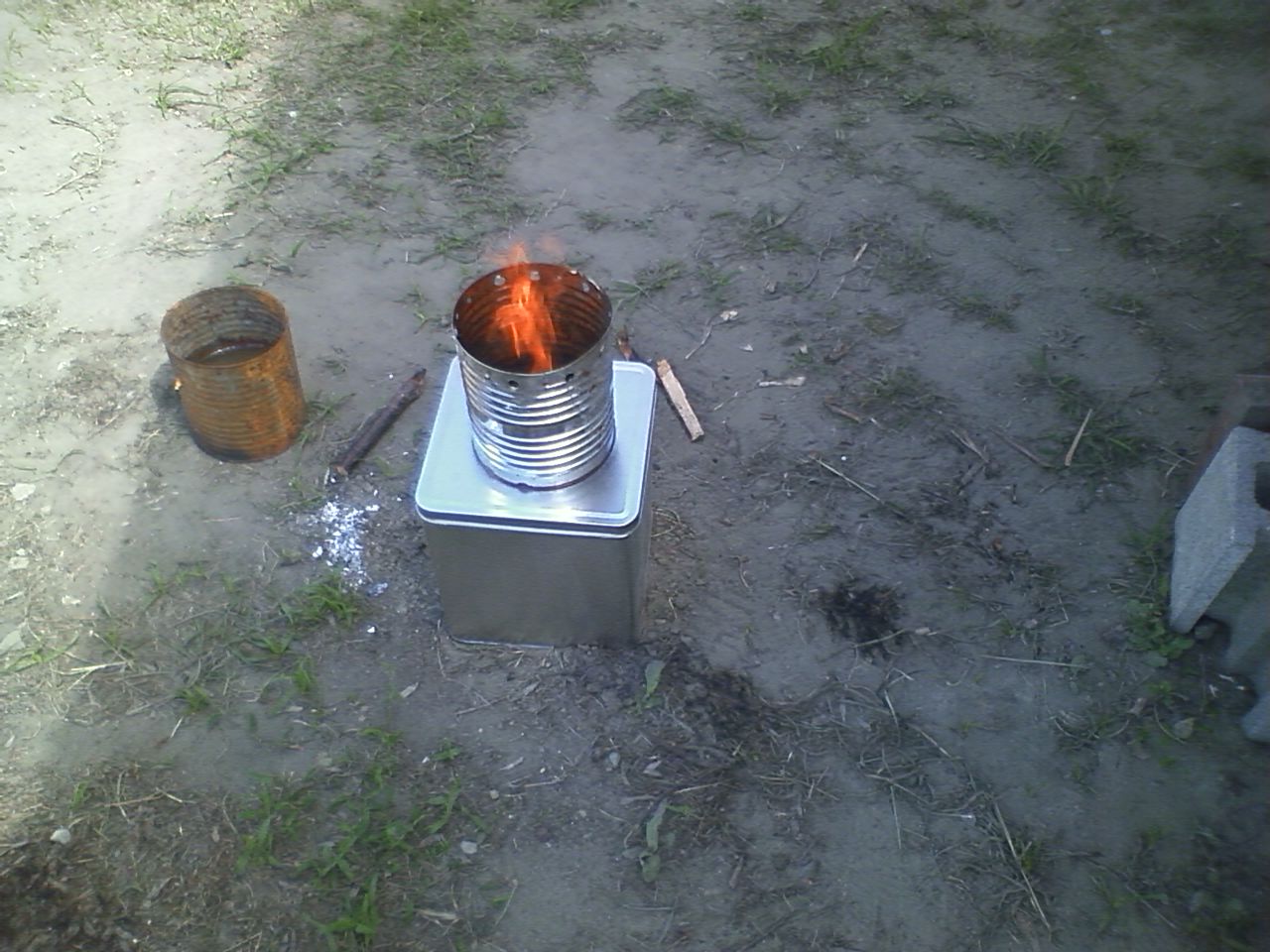 それからL字型煙突をせんべい缶に差し込んで、断熱材として庭の土でせんべい缶を満たした。